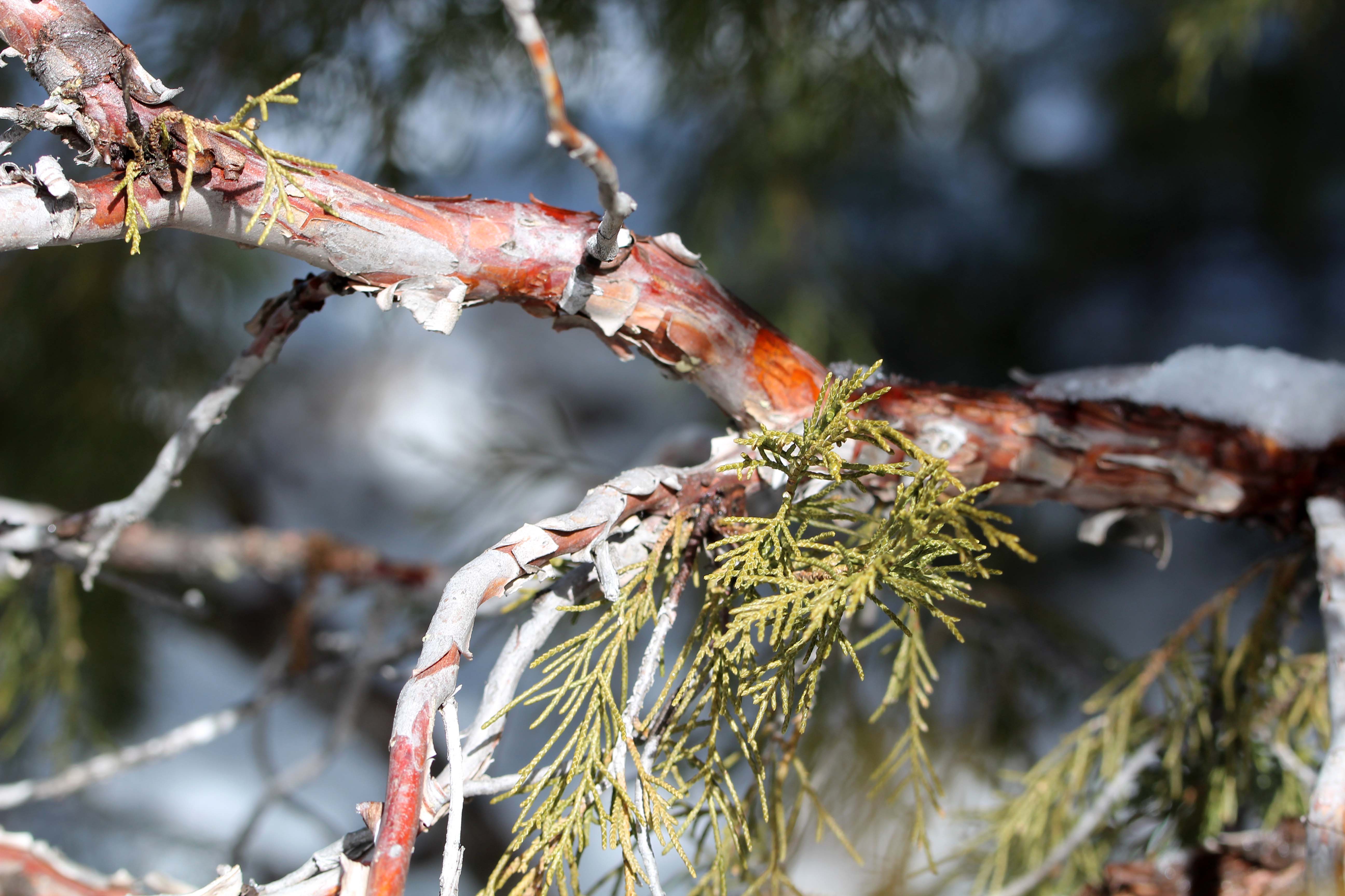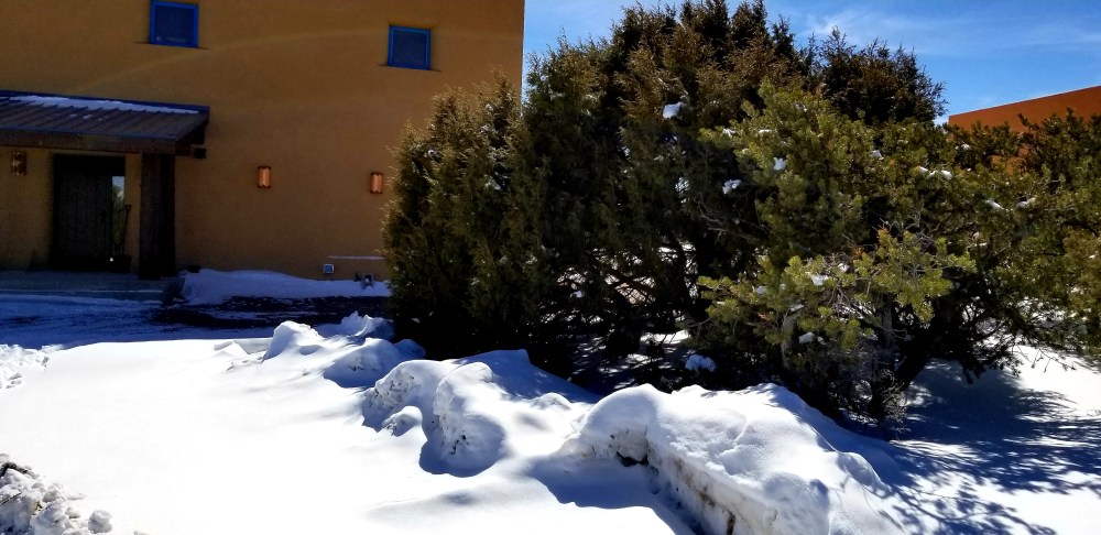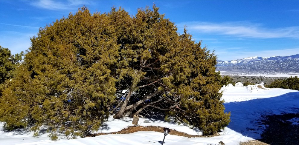Now you know why the Junipers are often called Red Cedar. This is the Sacred ‘Cedar’ in front of the house . We moved the house pad back about 15 feet so this tree would not be harmed.The One-seed Juniper has many trunks. Notice the full roundness created by having so many trunks.